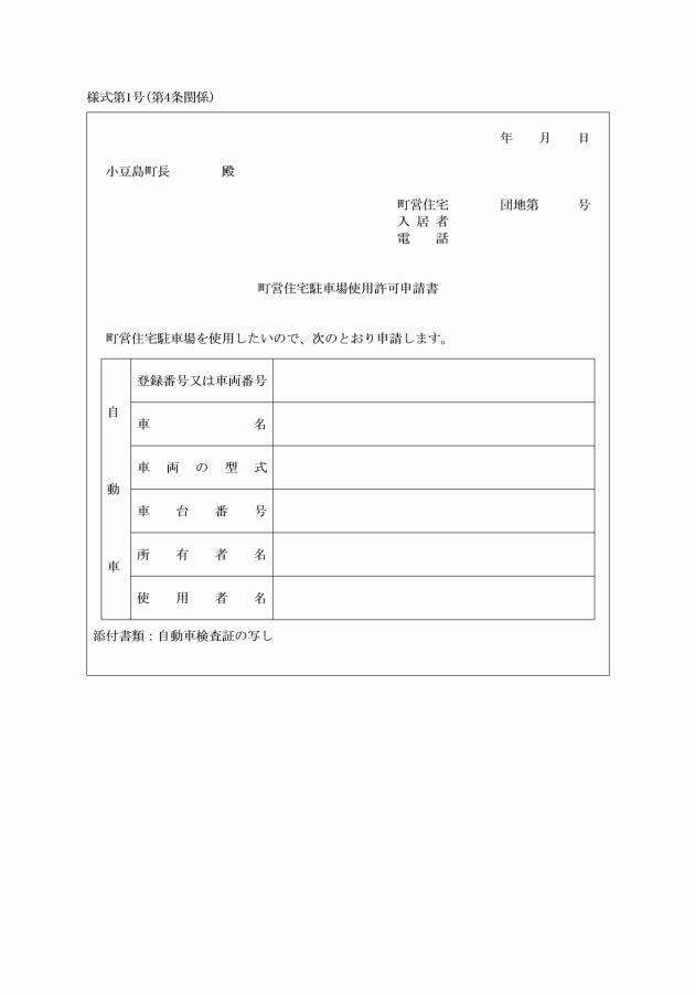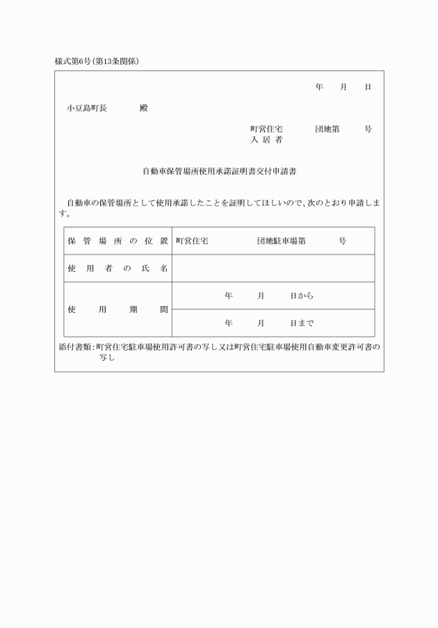 第13条 自動車の保管場所の確保等に関する法律施行規則(平成3年国家公安委員会規則第1号)による証明を受けようとする者は、自動車保管場所使用承諾証明書交付申請書(様式第6号)を町長に提出しなければならない。